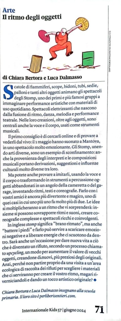 Il primo consiglio è di cercarli online e di provare a vederli dal vivo: il 1 maggio hanno suonato a Mantova, in uno spettacolo molto emozionante. Gli Stomp, unendo arti diverse, sono un esempio di sconfinamento: anche la provenienza degli interpreti e le composizioni musicali portano derivazioni, suggestioni e influenze culturali molto diverse tra loro. Ma potete anche provare a imitarli, usando la voce e il corpo o trasformando in strumenti a percussione oggetti abbandonati in un angolo della cameretta o del garage, inventando ritmi, testi e coreografie. Farlo con i vostri amici è ancora più divertente e magico, uno di quei casi in cui uno più uno fa molto più di due. Le idee si moltiplicheranno a un ritmo che vi sorprenderà: insieme si possono sovrapporre ritmi e suoni, creare coreografie complesse e spettacoli ricchi e coinvolgenti.