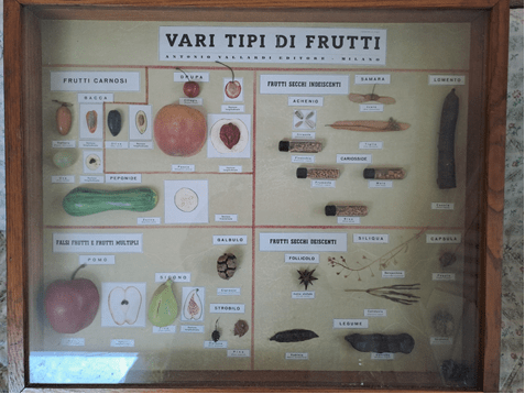 È stata portata in classe una teca universitaria storica, prestata dal Dipartimento di Scienze Agrarie, Forestali e Alimentari dell’Università di Torino, che ha permesso non tanto di inoltrarsi in distinzioni troppo complesse, ma per capire che tutte le piante sostanzialmente producono frutti e non solo quelle che comunemente consideriamo tali.