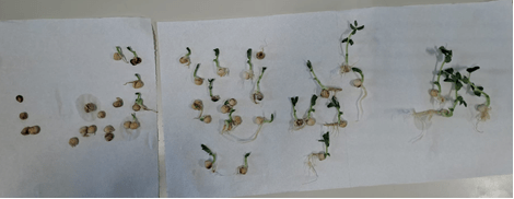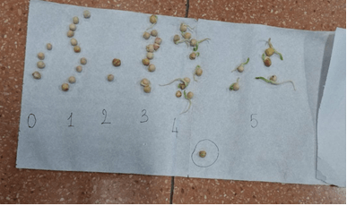 Dopo 7 giorni dalla semina dei ceci, abbiamo effettuato una prima osservazione della germinazione. Ognə bambinə ha dapprima potuto osservare e maneggiare delicatamente i semi contenuti nel proprio bicchiere. Poi, in un secondo momento, i semi/plantule in germinazione sono stati suddivisi fisicamente in gruppi omogenei per aspetto (e, quindi, per stadio di crescita). Una volta raggruppato, li abbiamo ordinati secondo le fasi di sviluppo: ingrossamento/entrata dell’acqua nel seme; fessurazione; emissione della radichetta; emissione della piumetta.