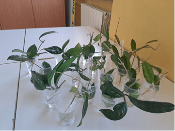 Ho portato in classe, dentro ad uno scatolone, quella che ho definito, senza che lɜ bambinɜ la vedessero, “un’ospite”. Ad un certo punto della lezione l’ho tirata fuori svelando la sorpresa: si tratta di una pianta di Hoya carnosa. È servita per far osservare loro da vicino insieme una pianta, toccandone rami e foglie, ma, soprattutto per introdurre la riproduzione vegetativa, cioè la capacità che le piante hanno di produrre una pianta identica a loro stesse dalla radicazione di una parte del loro corpo che non è il seme. Abbiamo prodotto delle talee tagliano porzioni dei lunghi fusti e mettendoli poi in acqua e ragionando sul fatto che le piante sono creature straordinarie, capaci di cose che noi non possiamo permetterci: posso creare un altro me stesso mettendo nell’acqua una parte di me senza la quale posso vivere senza problemi? La risposta per noi è no, ma per le piante sì.