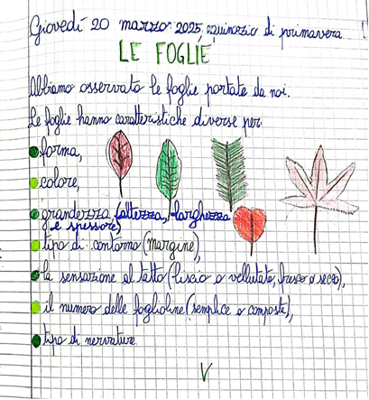 Disposti in un grande cerchio nell’atrio antistante la classe, lɜ bambinɜ hanno mostrato le (numerosissime) foglie raccolte, le hanno osservate e descritte secondo le loro competenze e poi abbiamo provato a coglierne somiglianze e differenze, in termini di: forma, colore, grandezza, tipo di margine, sensazione al tatto, numero di foglioline, nervature). Abbiamo poi riportato le nostre osservazioni sul quaderno, anche grazie al disegno dal reale di alcune delle foglie osservate.